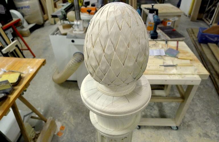 Trappaal met dennenappel maken. De gedraaide houten paal heeft fijne draaiwerk profielen en snijwerk op het kapiteel. Het beeldhouwwerk is een dennenappel snijwerk.